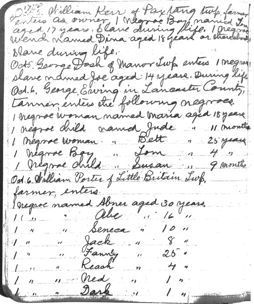 In 1780, the Pennsylvania General Assembly declared that all enslaved persons should be registered. In 1788, it declared that their children should also be registered. Together, these returns constitute a vast northern slavery archive and a promising resource for African-American genealogical research.