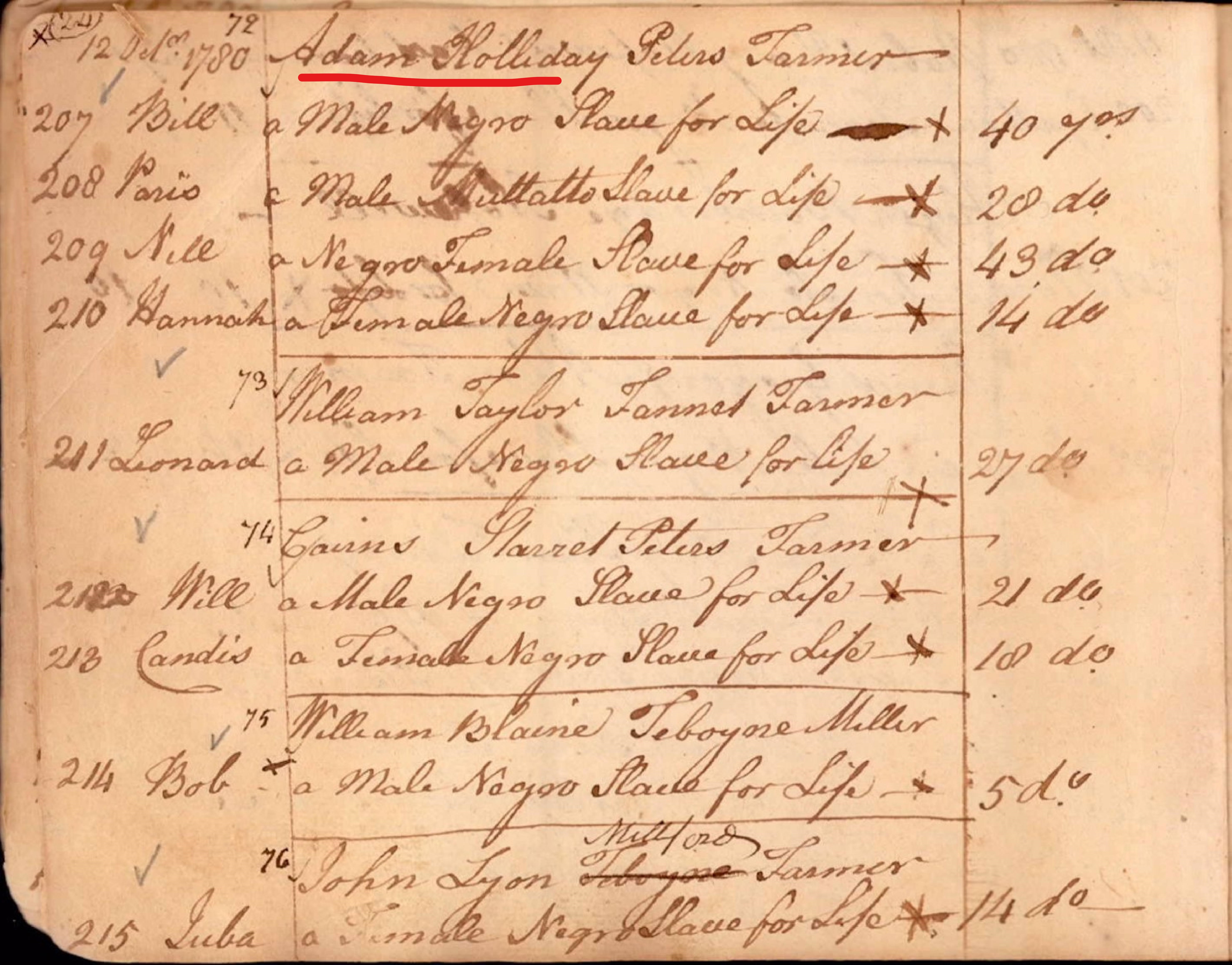 Nell, Bill, Paris, and Hannah were registered as lifetime slaves in Cumberland County on October 12, 1780 by Adam Holliday. In the 1790s, these men and women helped to establish the community that now bears the name of their enslaver. Today, Hollidaysburg is the Blair County seat.