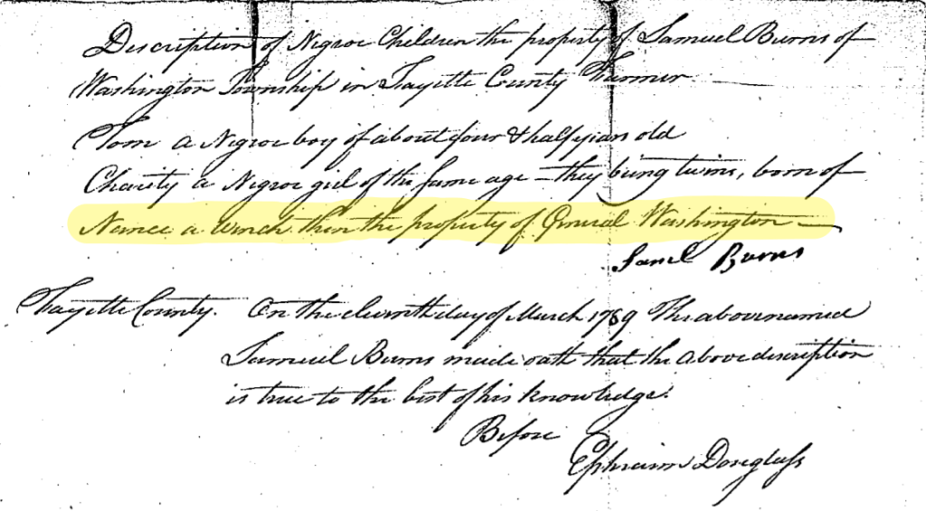 Shortly after Nance gave birth to Tom and Charity, Washington ordered the family back to Mount Vernon. The young mother refused to leave Pennsylvania, prompting the general to sell her and her children to separate buyers rather than force them back to Virginia in chains. Finding herself bound in a different township than her eldest children, Nance gave birth to a second set of twins whom she named George and Jane. Although she lived in a ‘free state,’ enslavers had separated Nance from her family once more.